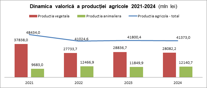 În anul 2024 valoric producția agricolă totală a constituit cca 41,37 mlrd lei, mai puțin cu peste 1% față de anul precedent și cu cca 14,5% față de anul 2021. Având în vedere nivelul inflației și fluctuațiile de prețuri pentru produsele vegetale și animaliere, se poate de constat că în termeni reali valoarea producției agricole s-a diminuat și ramură este în stagnare.