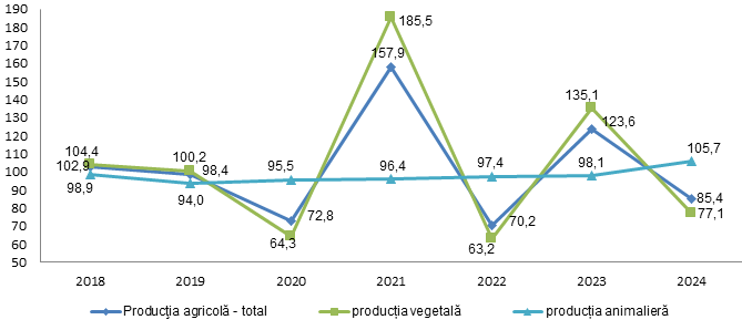 Cu toate acestea, în termeni cantitativi, în anul 2024 recolta de cereale, sfeclă de zahăr și leguminoase a scăzut cu peste 33% față de anul 2023. O dinamică negativă s-a înregistrat și pentru următoarele culturi vegetale: floarea soarelui (- 19%); soia (- 18,4%); rapița (–59,5%); cartofi (– 21,5%); fructe și nuci (–22,4%); struguri (-30,6%) etc.