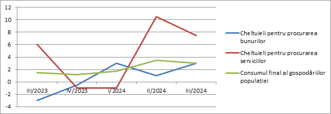 În ceea ce privește consumul populației, în primul trimestru al anului trecut s-a păstrat o dinamică joasă, iar cheltuielile pentru procurarea bunurilor a avut o dinamică ușor ascendentă începând cu trimestrul III și IV ale anului 2024, înregistrând creșteri de 2,9%  și 2,4% corespunzător față de perioada similară a anului 2023. Creșterea consumului a fost susținută de evoluția pozitivă a venitului disponibil al populației.